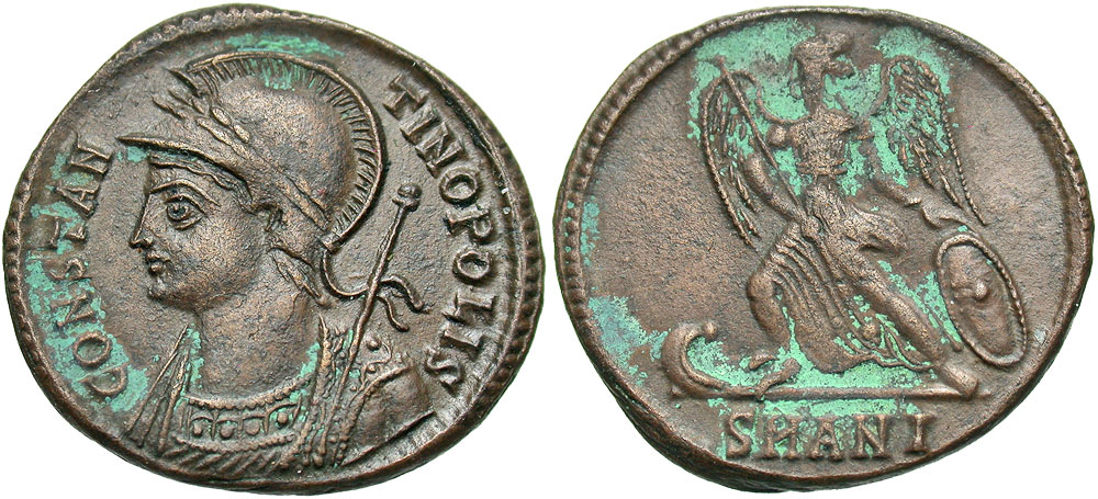 City Commemorative. A.D. 330-354. Æ follis (18 mm, 2.48 g, 6 h). Antioch mint, Struck A.D. 335. CONSTAN-TINOPOLIS, laureate and helmeted bust of Constantinople left, wearing imperial cloak, scepter over shoulder / Victory advancing left, foot on prow, holding scepter and resting hand on shield; SMANI. RIC 92. Good VF, brown patina with a few light deposits.