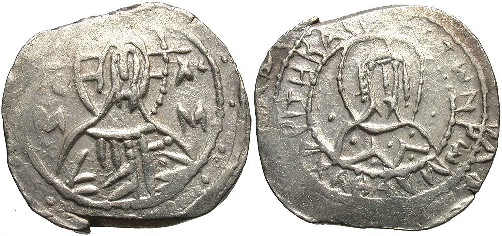 Manuel II Palaeologus. 1391-1423. AR stavraton (24 mm, 7.04 g, 7 h). Constantinople mint, Struck 1403-1425. Facing bust of Christ Pantokrator; barred IC XC across field; sigla: M - M / Crowned facing bust of Manuel II; sigla: pellet - pellet. DOC 1398-1400; Bendall 332.4, sigla 7; SB 2549.