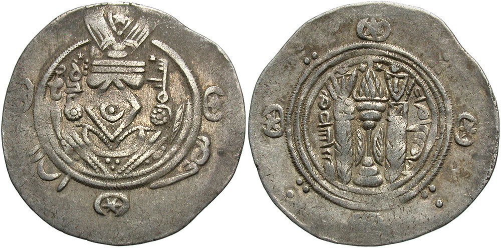Tabaristan, Abbasid Governors. Sulayman b. Musa. 787-789. AR hemidrachm (23 mm, 1.92 g, 9 h). Crowned Sasanian-style bust right / Fire altar flanked by attendants; star and crescent flanking flames. Album 65. VF, lightly toned.