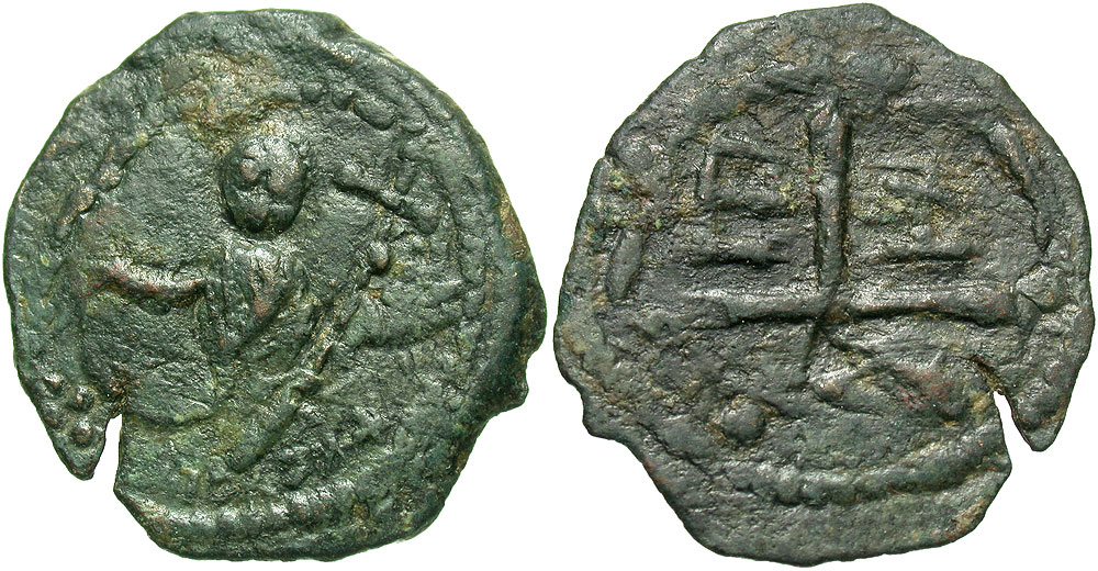 The authors of CCS note that the CCS 6 type is often found overstruck on another follis of Tancred, CCS 5, but this particular coin is overstruck on a follis of Tancred, CCS 4a, showing a turbaned facing bust of Tancred holding a sword (see the example in this sale). The outline of CCS 4a can be seen quite clearly by rotating the obverse to the 4h position. The reverse is unusual. Perhaps it is that the coin is overstruck which has caused the legend to be uncertain, but in reality it appears not to be obscured but rather a new type altogether. Depending on how the coin is rotated, the letters could be E and I (or Z), or IΠ and H. There are a half-dozen similar reverse types from the first quarter century or so of the 12th century at Antioch, but nothing which this could be. This appears to be an entirely new reverse type.