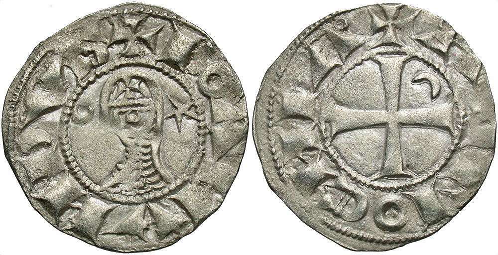 Crusader States, Principality of Antioch. Bohemond III. 1163-1201. BI denier (18 mm, 1.04 g, 6 h). + BOAMVИDVS, armored bust left; crescent and star in fields / + AИTIOCИIA, short cross with crescent in 2nd angle. Metcalf 388-91; CCS 66b. Good VF.