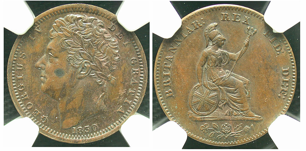 Lot 35-404. England. George IV. 1830. 1/2 farthing. For use in Ceylon. Ex R. L. Lissner Collection (CNG / St. James / M. Teller, 1-2 August 2014), 472.