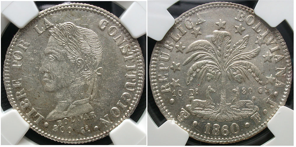 Bolivia, Republic. 1860-PTS FJ. 4 soles (28 mm, 10.07 g). KM 139. NGC Unc Details, obverse scratched. Very rare one-year type.