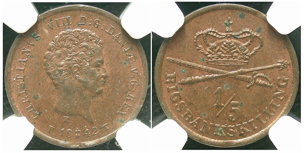 Denmark. Christian VIII. 1842-FF. 1/5 rigsbankskilling (15 mm, 1.53 g). KM 724. NGC MS62 BN, One-year type. Highest ever graded.