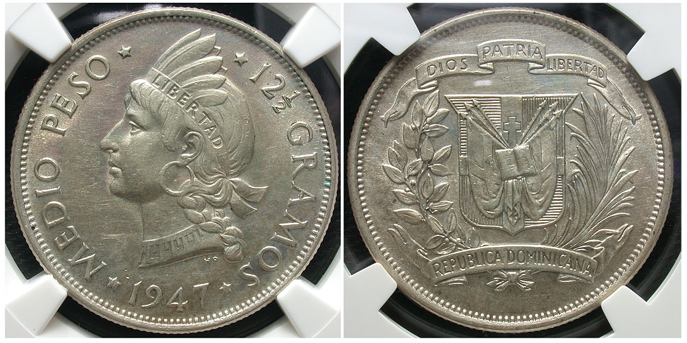 Dominican Republic. 1947. 1/2 peso (30 mm, 12.53 g). KM 21. NGC MS61. Ex R. L. Lissner Collection (CNG / St. James / M. Teller, 1-2 August 2014), 1619. The auction catalogue of the Lissner collection notes: "Brilliant uncirculated with very pale rainbow iridescence. Very undergraded."
