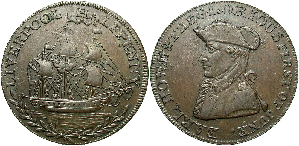 Great Britain, Lancaster. Liverpool. ND. Æ Conder Token Halfpenny (29 mm, 9.01 g). LIVERPOOL HALFPENNY, ship / EARL HOWL & THE GLORIOUS FIRST OF JUNE., bust of Earl Howl left. Edge: BIRMINGHAM REDRUTH & SWANSEA. Dalton & Hammer 120. AU.