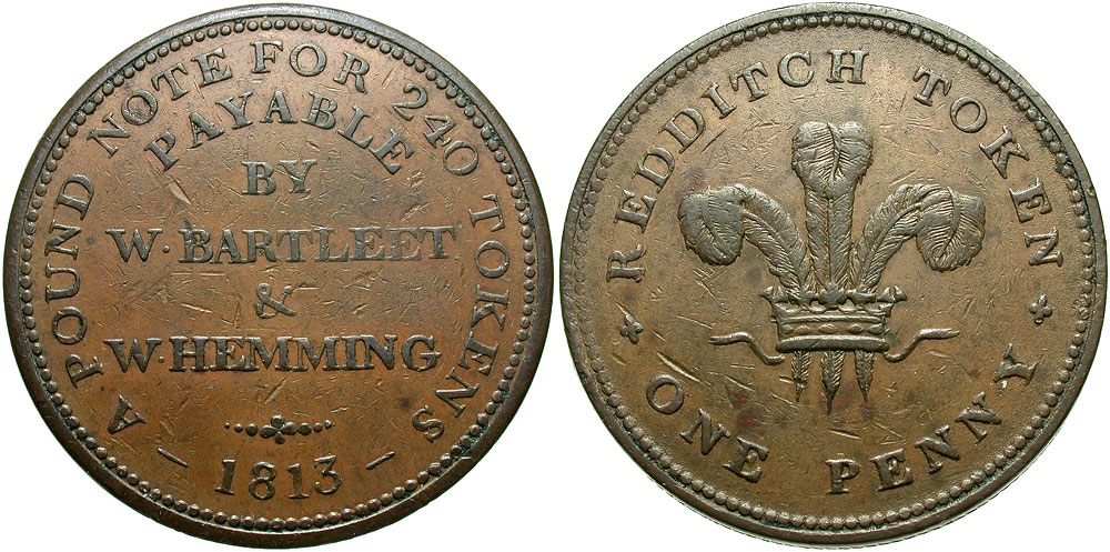 Great Britain, Worchestershire. Redditch. 1813. Æ Trade Token Penny (34 mm, 18.55 g). A POUND NOTE FOR 240 TOKENS , PAYABLE BY W · BARTLEET & W · HEMMING, 1813 / REDDITCH TOKEN, ONE PENNY, Prince of Wales' crest. Seaby 12-13. VF, surface marks.