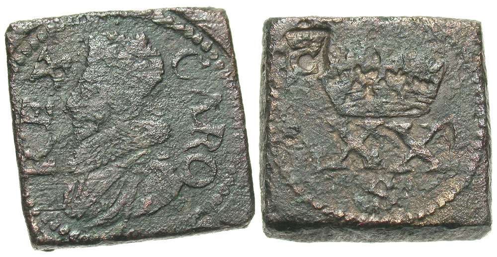 England. Charles I. 1625-1649. Æ Unite Weight (16 mm, 8.56 g). CARO REX (diamond stops), crowned and draped bust left, with ruff / Crown above XX, S below; c/m: crowned C. Withers 900. VF, dark brown patina, a little porous.