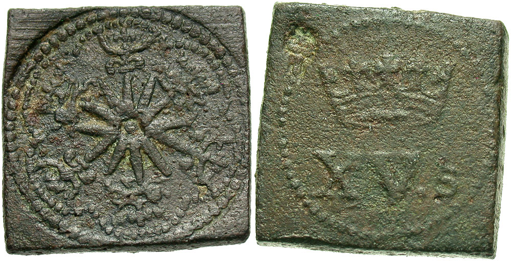 England. James I. 1603-1625. Æ Spur Ryal Weight (16 mm, 5.91 g). 'Spur' composed of sun in splendor with rose in center, surrounded by six tressures containing alternately lions and lis, each lis cupped by an ornament / Large crown above XV· S; c/m: crowned I. Withers 610. VF, dark brown patina, light porosity.