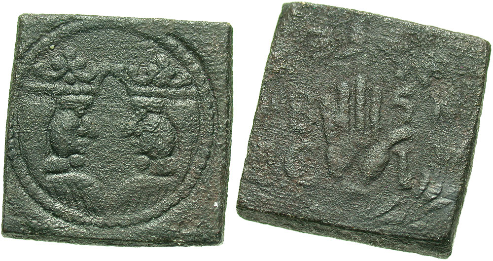 Spain. Ferdinand and Isabella I. 1469-1504. Æ Double Excellent Weight (15 mm, 6.33 g). Dated (15)85. Cornelius Janssen (1564-1604), manufacturer. Confronted crowned busts of Ferdinand, on left, and Isabella, on right / Hand symbol (for Antwerp); 8-5/C-I across field; all within wreath. Withers & Withers pp. 30-1, and p. 60. VF, brown patina, light porosity.