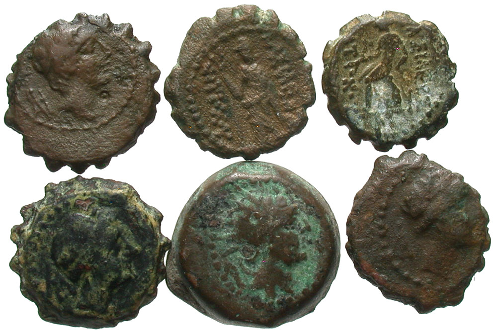 Lot 35-453. [Greek]. Lot of six small Seleukid Æ of Antiochos IV from Ake-Ptolemaïs, all from the Kenneth Miller Collection.