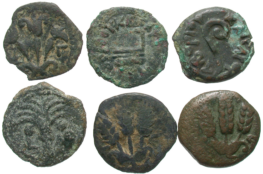 [Judaean]. Lot of six Herodian and Procuratorial Æ. Includes: Agrippa I (2) // Coponius // Valerius Gratus // Pontius Pilate (2, two different types). Fine-VF, the two Pontius Pilate pruthot VF.