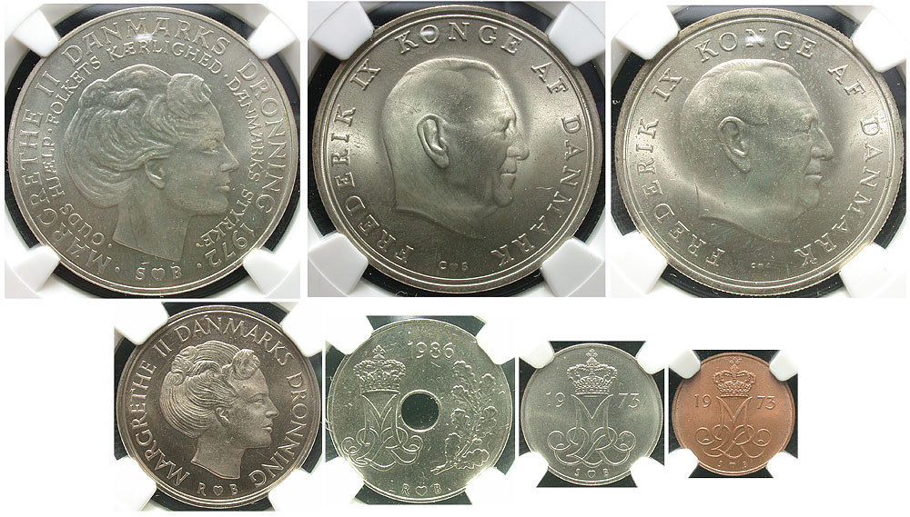 [Modern World]. Lot of seven certified modern Danish coins, all ex R. L. Lissner Collection. Includes: 5 ore. 1973-S B. NGC MS65 RB // 10 ore. 1973-S B. NGC MS67 // 25 ore. 1986-R B. NGC MS66 // 1 krone. 1987-R B. NGC MS68 // 10 kroner. 1967-C S. Wedding of Magrethe. NGC MS66 // 10 kroner. 1968-C S. Wedding of Benedikte. NGC MS67 // 10 kroner. 1972-S B. Accession of Margrethe II. NGC MS66. All group lots are sold as-is, returns not accepted. The coins shown are the exact coins you will receive. Ex R. L. Lissner Collection (CNG / St. James / M. Teller, 1-2 August 2014), 239.