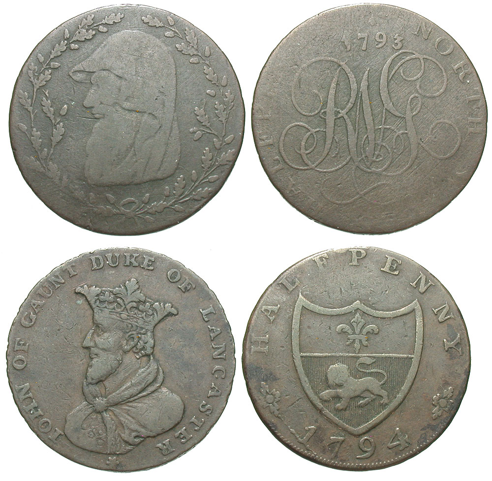 [Modern World]. Lot of two British Conder halfpenny tokens. Incldes: Lancaster. 1794. John of Gaunt. Dalton & Hammer 44. gFine // North Wales. 1793. Druid. Dalton & Hammer 1d. VG.