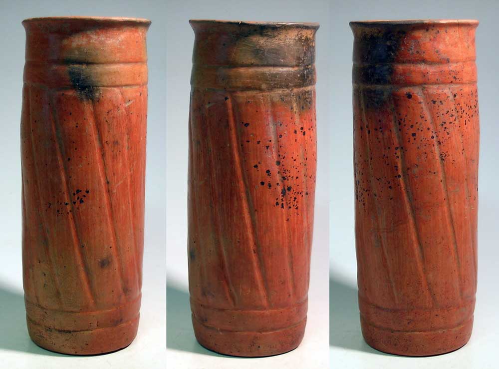 Maya Vase, ca. 400 - 700 AD. A beautiful Maya vase from the Pacific slope region, ca. 400 - 700 AD. This slender cylinder is 9-1/8� high and has diagonally fluted d�cor. The highly burnished slip shows good mineral deposits. An elegant form in excellent condition. Ex Tribal Treasures Gallery. Value Range: $800 - $1200.
