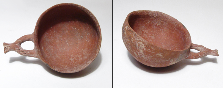 A Cypriot Red-Polished Ware Bowl. A Cypriot, Red-Polished Ware bowl, Early Cypriot III - Middle Cypriot I, c. 2000 - 1800 BC, hand built, the bowl deeply rounded with thin rim and wishbone handle decorated with incised lines. L: 5 ï¾½ï¾ (14 cm); H: 2 ï¾¼ï¾ (5.7 cm). Intact, some light surface weathering and deposits. Ex Midwest private collection with Cypriot export documents dated 1963. Est Value $400 - $500.