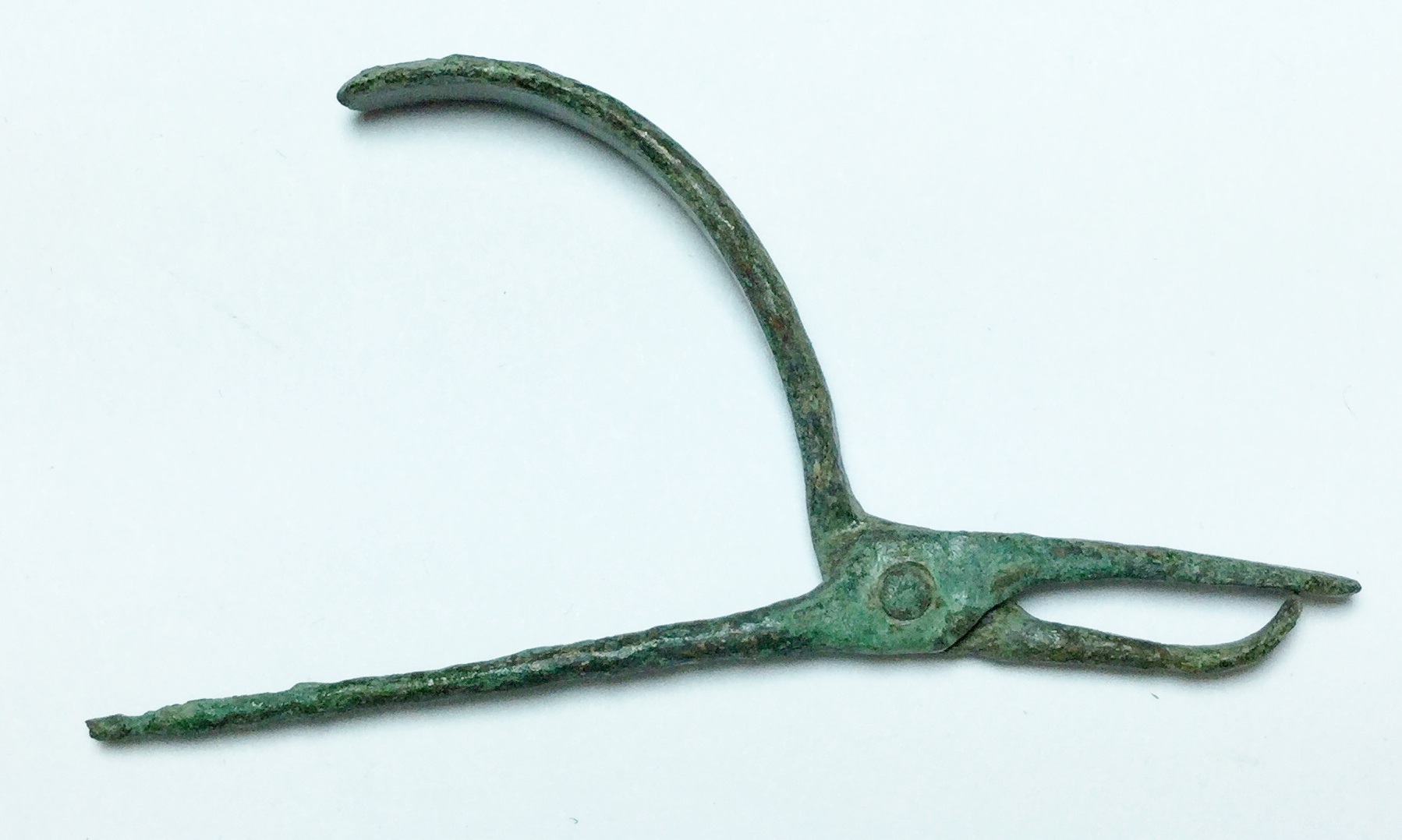 Roman Bronze Tweezers, circa 2nd-5th Century AD. Roman Bronze Tweezers, circa 2nd-5th Century AD: A very interesting set of tweezers with a decorated handled. The piece is intact with a tiny bend end the one of the pinchers; measures AE 35 x 60 mm; and has nice green patina.