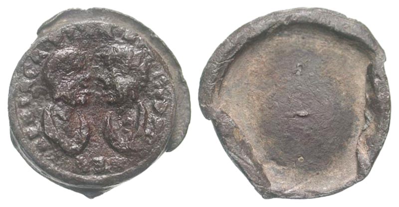 Roman Lead Seal with vis a vis Busts. Two laureate or diademed and draped busts facing vis a vis. The faces may be that of two young emperors but the legend is not clear. 27 mm, uniface.