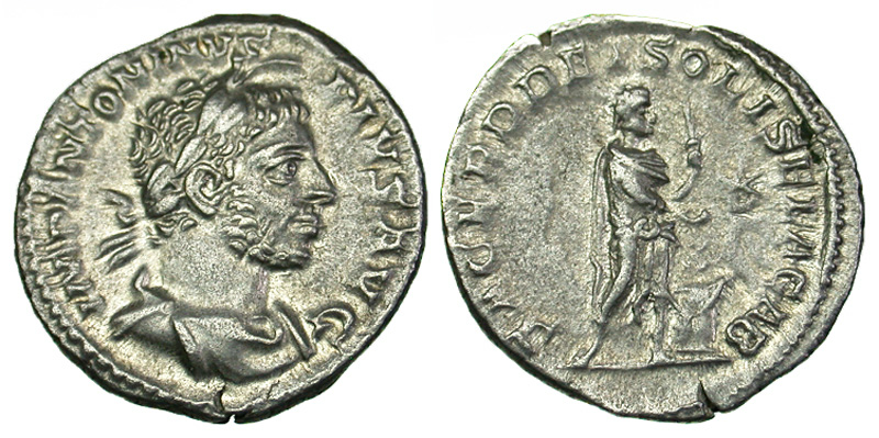 Elagabalus. A.D. 218-222. AR denarius (19.1 mm, 3.17 g, 1 h). Rome, A.D. 221-222. IMP ANTONIVS PIVS AVG, lauteate, horned, and draped bust right / SACERD DEI SOLIS ELAGAB, Elagabalus standing facing, head right, club upright in left hand, sacrificing from patera in right hand over lit altar at right, * in right field. RIC 131; RSC 246. near EF.