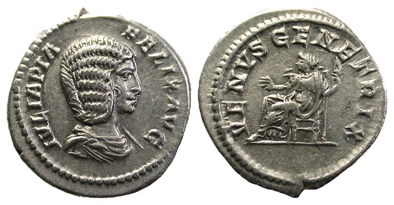 Lot 5-128. Julia Domna. Augusta, A.D. 193-217. AR denarius. Rome, A.D. 215-217.
