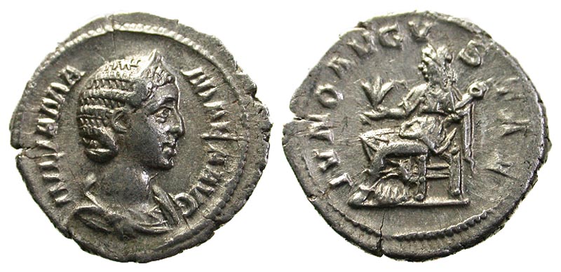 Julia Mamaea. Augusta, A.D. 222-235. AR denarius (20.8 mm, 3.11 g, 7 h). Rome, A.D. 231. IVLIA MAMAEA AVG, draped bust right / IVNO AVGVSTAE, Juon seated left, holding flower and scepter. RIC 341 (S Alexander); BMCRE 755 (S Alexander); RSC 32. gVF.
