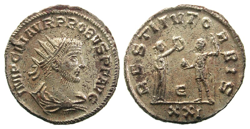 Probus. A.D. 276-282. AR antoninianus (21.2 mm, 3.86 g, 11 h). Antioch, A.D. 280. IMP C M AVR PROVBS P F AVG, radiate, draped and cuirassed bust right / RESTITVT ORBIS, female personification of Orbis Terrarum standing, facing right, holding wreath; emperor standing, facing left, holding globe and scepter; A between, XXI in exergue. RIC 925. VF, fully silvered.