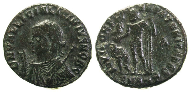 Licinius II. Caesar, A.D. 317-324. Æ 3 (18.3 mm, 2.65 g, 11 h). Antioch, A.D. 317-320. DN VAL LICIN LICINIVS NOB C, laureate and draped bust left, holding globe, mappa and scepter / IOVI CONSERVATORI CAESS, Jupiter standing left, holding Victory on a globe and scepter, captive at feet left; SMANTS/Δ in exergue and field. RIC 29. aVF, blue-green patina.