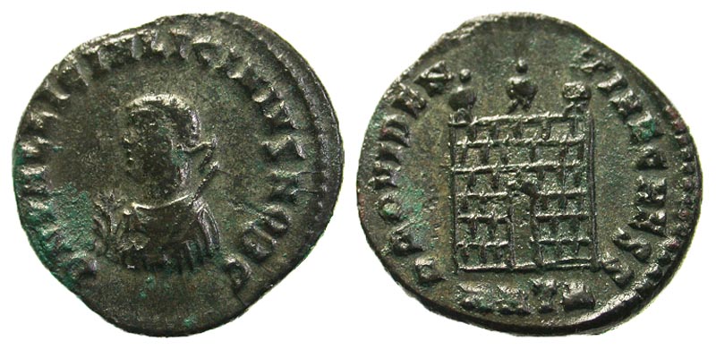 Licinius II. Caesar, A.D. 317-324. Æ 3 (18.2 mm, 2.87 g, 7 h). Heraclea, A.D. 317. DN VAL LICIN LICINIVS NOB C, laureate and draped bust left, holding globe, mappa and scepter / PROVIDENTIAE CAESS, camp gate with three turrets above; MHTA in exe. RIC 19. aVF.