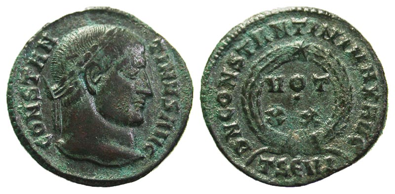 Constantine I. A.D. 307/10-337. Æ 3 (18.3 mm, 2.94 g, 11 h). Thessalonica, A.D. 320-324. CONSTANTINVS AVG, laureate head right / D N CONSTANTINI MAX AVG, legend around VOT/XX; TSЄVI in exe. RIC 101/123. VF, blue-green patina.
