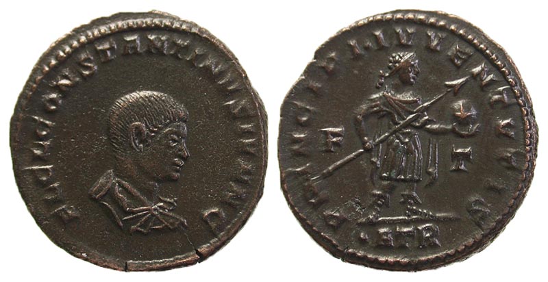 Constantine II. As Caesar, A.D. 317-337. Æ 3 (20.6 mm, 3.46 g, 12 h). Trier, A.D. 317. FL CL CONSTANTINVS IVN NC, bare-headed, draped and cuirassed bust right / PRINCIPI IVVENTVTIS, Constantine in military dress standing right holding globe and spear, F-T across fields; ·ATR in exe. RIC 144. EF.