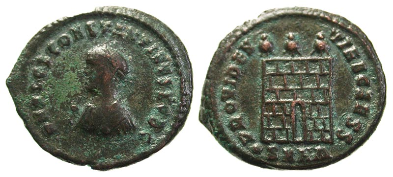 Constantine II. As Caesar, A.D. 317-337. Æ 3 (19.2 mm, 3.34 g, 7 h). Heraclea, A.D. 318-320. DN FL CL CONSTANTINVS NOB C, laureate and draped consular bust left, holding globe, scepter and mappa / PROVIDENTIAE CAESS, camp gate with three turrets above; ·SMHA in exe. RIC 46. F/VF, attractive blue-green patina.
