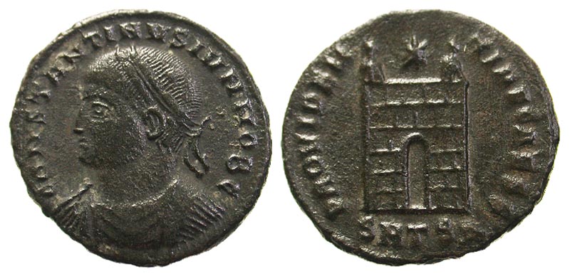 Constantine II. As Caesar, A.D. 317-337. Æ 3 (19.3 mm, 3.04 g, 11 h). Thessalonica, A.D. 318-320. CONSTANTINVS IVN NOB C, laureate, draped, and cuirassed bust left / PROVIDENTIAE CAESS, camp gate with two turrets, one star above; SMTSA in exe. RIC 157; LRBC 815. F/VF.