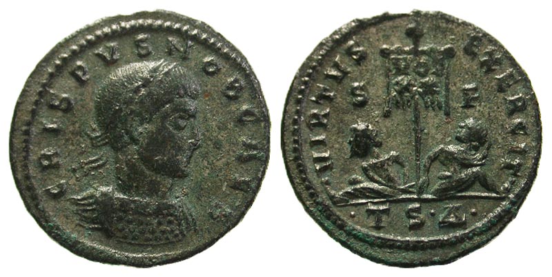 Crispus. Caesar, A.D. 317-326. Æ 3 (19.2 mm, 2.77 g, 6 h). Thessalonica, A.D. 320. CRISPVS NOB CAES, laureate and cuirassed bust right / VIRTVS EXERCIT, two captives seated between banner with VOT/XX, S-F in fields; ·T·S·Δ· in exe. RIC 77. VF, attractive green patina.