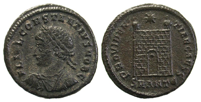 Constantius II. As Caesar, A.D. 324-337. Æ 3 (19.7 mm, 3.17 g, 6 h). Thessalonica, A.D. 325-326. FL IVL CONSTANTIVS NOB C, laureate, draped, and cuirassed bust left / PROVIDENTIAE CAESS, camp gate with two turrets, one star above; SMANTЄ in exe. RIC 66; LRBC 1354. Fine.