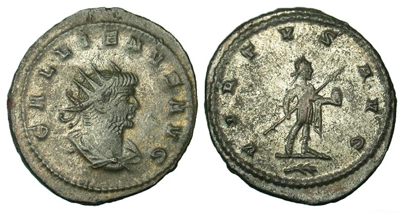 Gallienus. A.D. 253-268. BI antoninianus (23.0 mm, 4.07 g, 1 h). Antioch, A.D. 265. GALLIENVS AVG, radiate, draped, and cuirassed bust right / VIRTVS AVG, Gallienus standing right, holding transverse spear and globe, branch in exergue. Göbl 1636c; RIC 670 (Asian mint); RSC 1258. gVF, fully silvered. Scarce type.