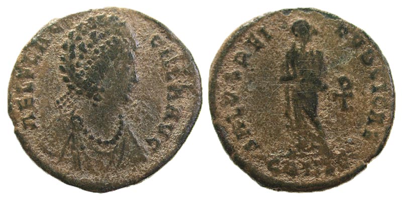 Aelia Flaccilla. Augusta, A.D. 379-386/8. Æ 2 (22.7 mm, 4.79 g, 11 h). Constantinople, A.D. 383-388. AEL FLACCILLA AVG, pearl-diademed and draped bust right / SALVS REIPVBLICAE, Empress standing facing, arms folded over chest; chi-rho to right, CONSE in exe. RIC 82.3; LRBC 2181. aVF, sandy patina.