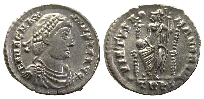 Lot 5-172. Magnus Maximus. A.D. 383-388. AR siliqua. Trier, A.D. 392-395. Ex Gussage All Saints Dorset hoard. Spink 12026, lot 433.