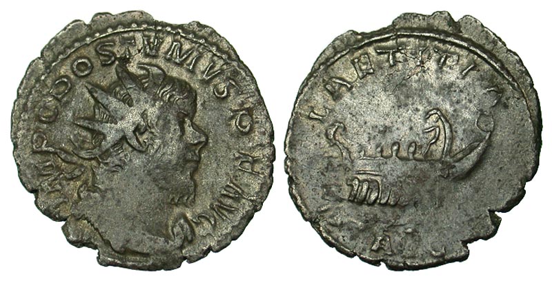 Postumus. Gallic Emperor, A.D. 260-269. AR antoninianus (22.7 mm, 2.50 g, 1 h). Treveri, A.D. 261. IMP C POSTVMVS P F AVG, radiate, draped, and cuirassed bust right / LAETITIA AVG, galley left, with rowers and helmsman. RIC 73; RSC 167a. aVF, toned.