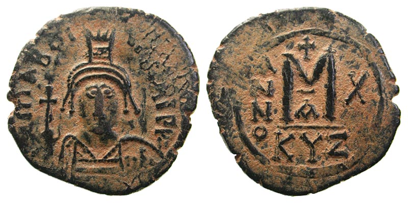 Lot 5-182. Maurice Tiberius. 582-602. Æ Follis. Cyzicus, Year 10 = 591/592.