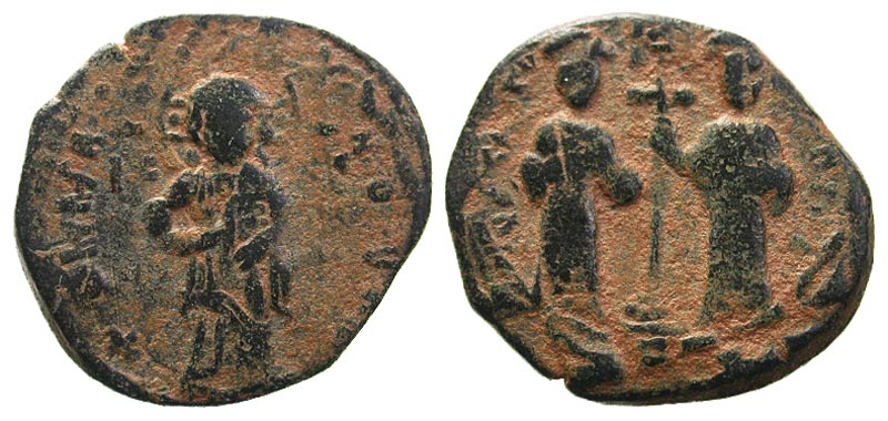 Constantine X Ducas. 1059-1067. Æ Follis (28.0 mm, 6.78 g, 7 h). Constantinople. +EMMA NOVHA, IC-XC, Christ standing facing on footstool, wearing nimbus and holding Book of Gospels, / EVDKARO +KWNTAK, Eudocia on left, Constantine on right, standing facing, holding labarum with cross on shaft between them, standing on three steps, each wears crown and loros, and place hand on heart. SBV 1853; DOC 8. Fine, Sandy red patina.