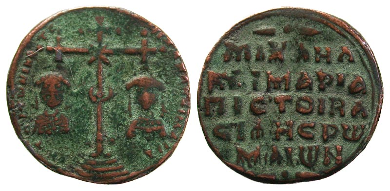 Michael VII Ducas. 1071-1078. AR miliaresion (struck in Æ) (20.3 mm, 3.09 g, 11 h). EN TOVTW NIKATЄ MIXAHΛ S MARIA (or similar), cross crosslet on globus resting on three steps, x at center of cross, pellet within crescent on shaft; facing bust of Michael, bearded, wearing crown and jewelled chlamys to left, facing bust of Maria, wearing crown and loros to right, triple border / MIXAHΛ KAI MARIA ΠICTOI PACIΛEIC PWMAIWN, in five lines, triple border. cf. SBV 1874; cf. DOC 6. VF, green patina.