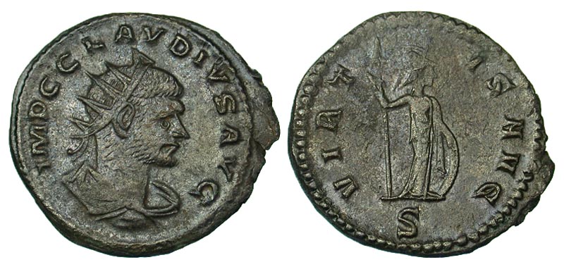 Claudius II Gothicus. A.D. 268-270. Æ antoninianus (21.5 mm, 3.34 g, 6 h). Antioch, A.D. 268. IMP C CLAVDIVS AVG, radiate, draped, and cuirassed bust right / VIRTVS AVG, Minerva standing left, resting hand on shield, holding spear. RIC 225. VF.