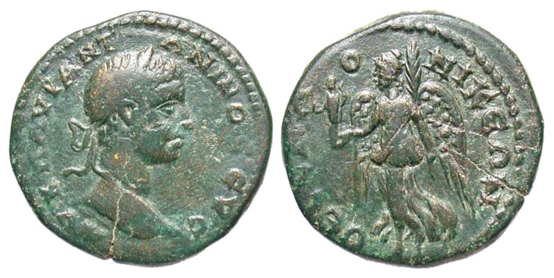Macedon, Thessalonica. Elagabalus. A.D. 218-222. Æ 22 (22.4 mm, 5.34 g, 1 h). AV K M AVP ANTΩNINOC ЄVC, laureate head right / ΘECCAΛONIKEΩN, Nike advancing left, holding small Kabiros and palm branch. Varbanov 4447 var; Touratsoglou 226 var. VF, small flan crack. Rare variety.