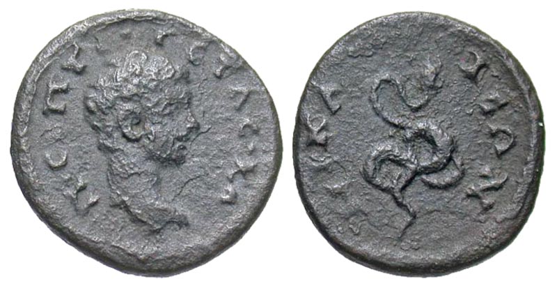 Bithynia, Nicaea. Geta. As Caesar, A.D. 198-209. Æ hemiassarion (16.4 mm, 2.19 g, 1 h). Π CEΠT ΓETAC KA, bare head right / NIKAIEΩN, coiled serpent. Rec Gen 517 var (obv legend); SNG von Aulock -; Weiser - ; BMC -. VF. Rare.