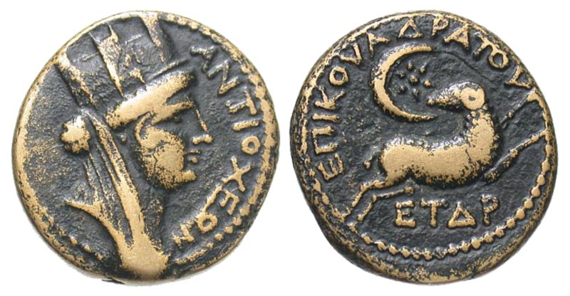 Syria, Seleucis and Pieria. Antiochia ad Orontem. Civic Issue. Time of Nero, A.D. 54-68. Æ trichalkon (19.4 mm, 5.49 g, 11 h). Dated year 104 of the Caesarean Era (AD 55/6). ANTIOXEΩN, Turreted and veiled bust of Tyche right / EΠI KOVAΔOPATOV, ET ΔP, ram leaping right, head left; star and crescent moon above, date below. McAlee 101; RPC 4287; BMC 70. VF.