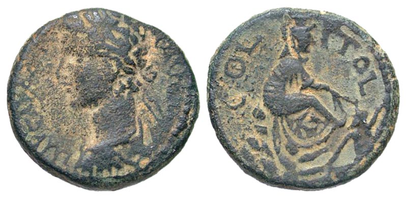 Phoenicia, Ake-Ptolemaïs. Commodus. A.D. 177-192. Æ 24 (24.2 mm, 10.27 g, 11 h). IMP C M [AVREL M AV COMMODVS], laureate head right / COL PTOL, Tyche seated right on rocks, holding grain ears; river-god swimming right below. Rosenberger 51; Kadman 114. aVF, black patina with red highlights. From the Kenneth Miller Collection of Ake-Ptolemaïs and Related Biblical Coins.