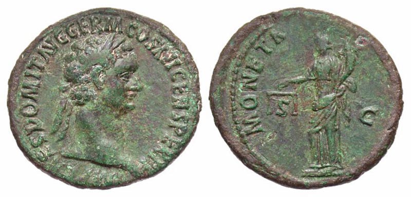 Domitian. A.D. 81-96. Æ as (28.3 mm, 11.18 g, 6 h). Rome mint, Struck A.D. 86. IMP CAES DOMIT AVG GERM COS XII CENS PER P P, laureate head right / MONETA AVGVST, SC, Moneta standing left, holding scales and cornucopia. RIC 496. VF, porous, attractive portrait.