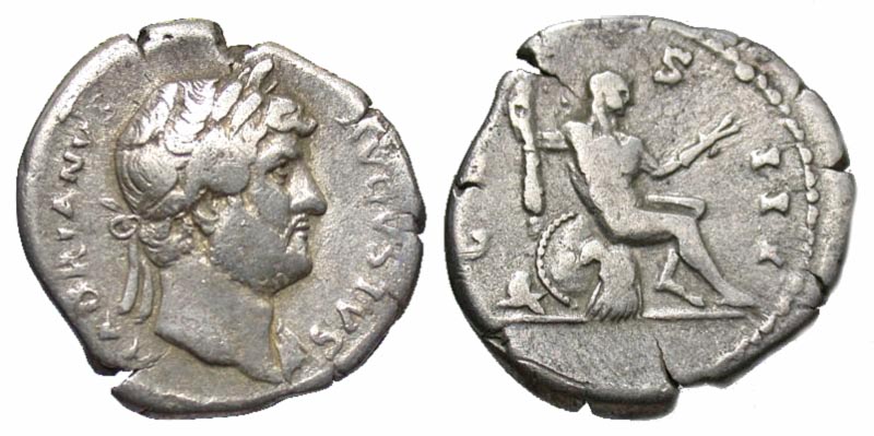 Lot 37-186. Hadrian. A.D. 117-138. AR denarius. Rome mint, Struck A.D. 119-125.
