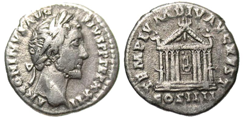 Antoninus Pius. A.D. 138-161. AR denarius (17.1 mm, 2.73 g, 1 h). Rome mint, Struck A.D. 158-159. ANTONINVS AVG PIVS P P TR P XXII, laureate head right / TEMPLVM DIV AVG REST COS IIII, seated figures of Divus Augustus and Livia, set on podium, within octastyle temple. RIC 290a; BMCRE 939; RSC 804. aVF.