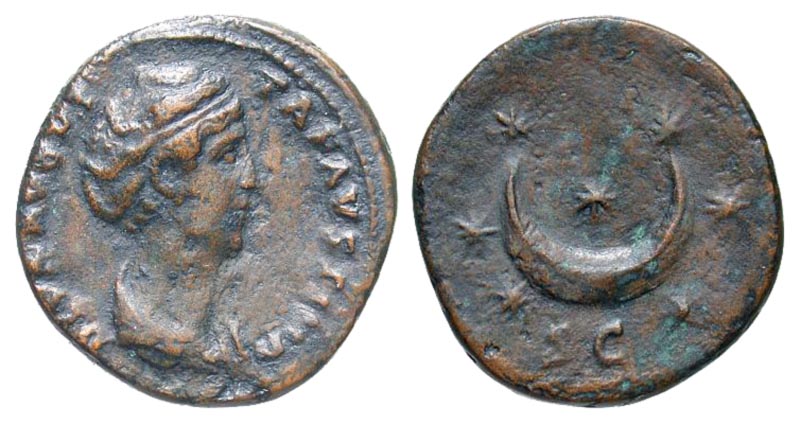 Diva Faustina I. Died A.D. 140/1. Æ as (27.3 mm, 10.72 g, 11 h). Rome mint, Struck A.D. 141-146. DIVA AVGVSTA FAVSTINA, diademed and draped bust right / SC, crescent and seven stars. RIC 1199 (A. Pius); BMCRE 1476 (A. Pius). Fine.